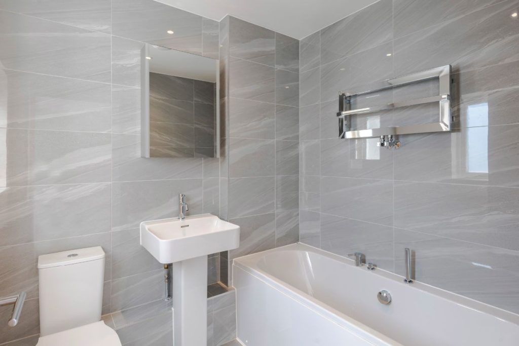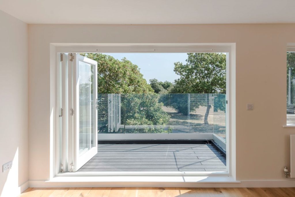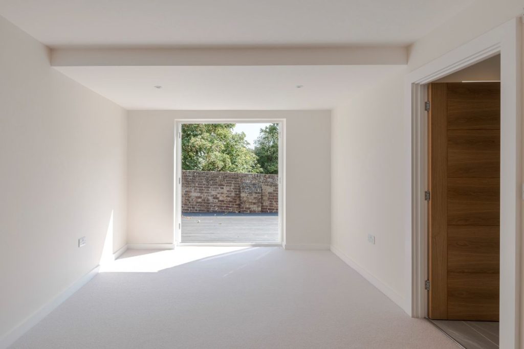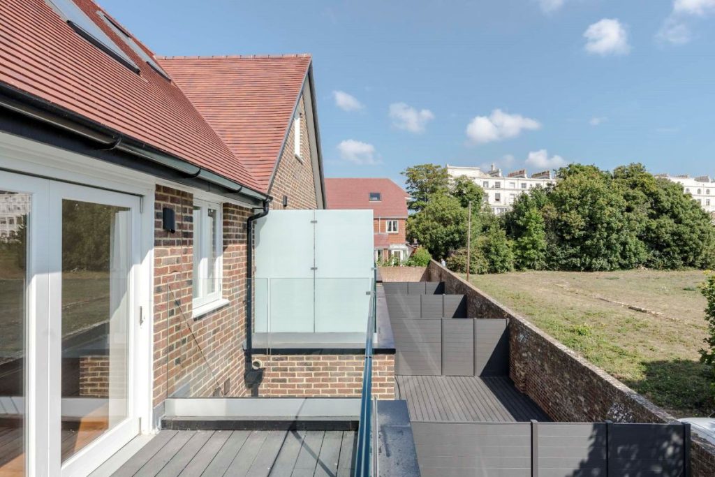 The topmost level hosts another generously sized bedroom, complete with an en-suite, Velux windows, and panoramic views. The upper floor also houses two thoughtfully designed bathrooms and an open-plan reception area spanning an impressive area. Transitioning from the living space, an intimate private terrace again generously proportioned and granting panoramic views of the lush communal area and the captivating expanse of Pegwell Bay.