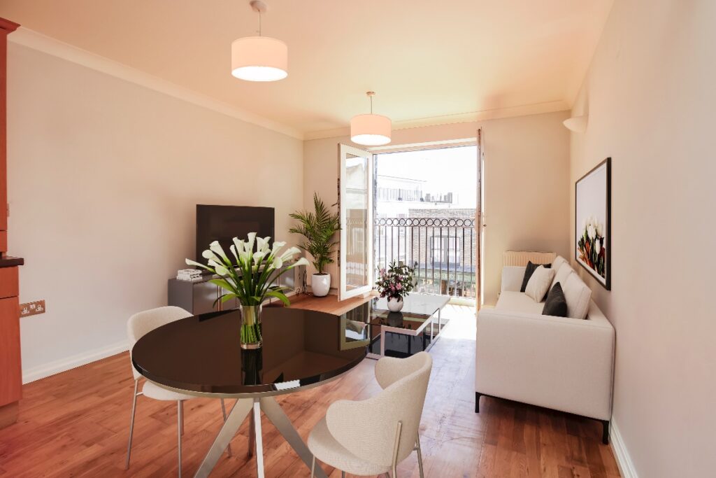 This welcoming apartment has a generous open-plan living and kitchen area, beautifully finished with solid wood flooring that flows seamlessly throughout the main living space. Natural light floods in through the Juliet balcony, creating a bright and inviting atmosphere perfect for both relaxing and entertaining. The modern kitchen features sleek fitted units complemented by integrated appliances, offering both style and practicality for everyday living.