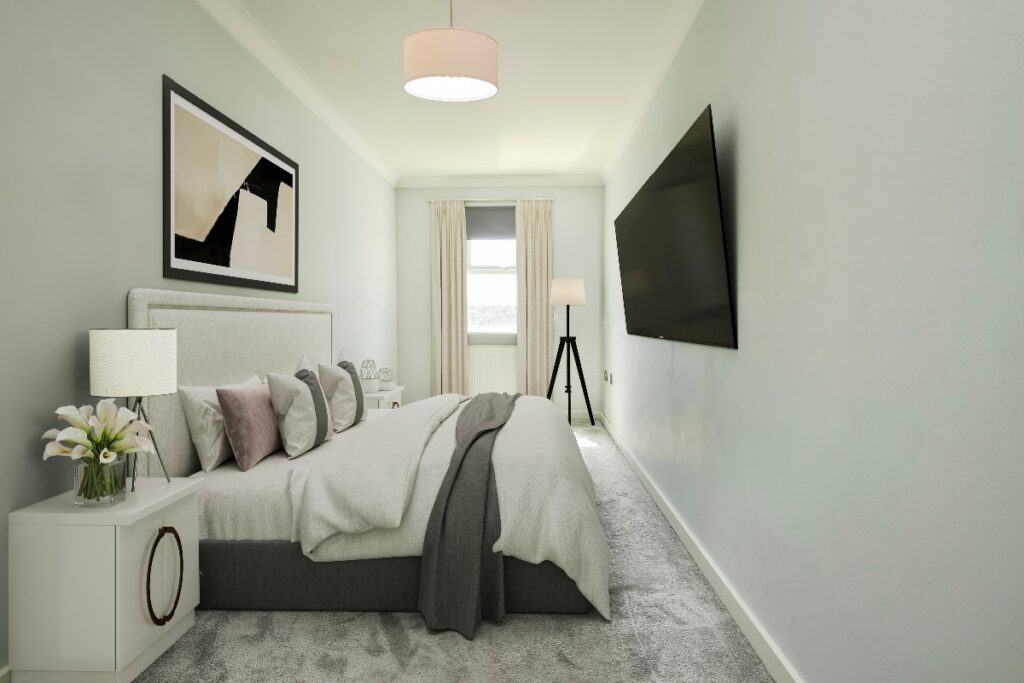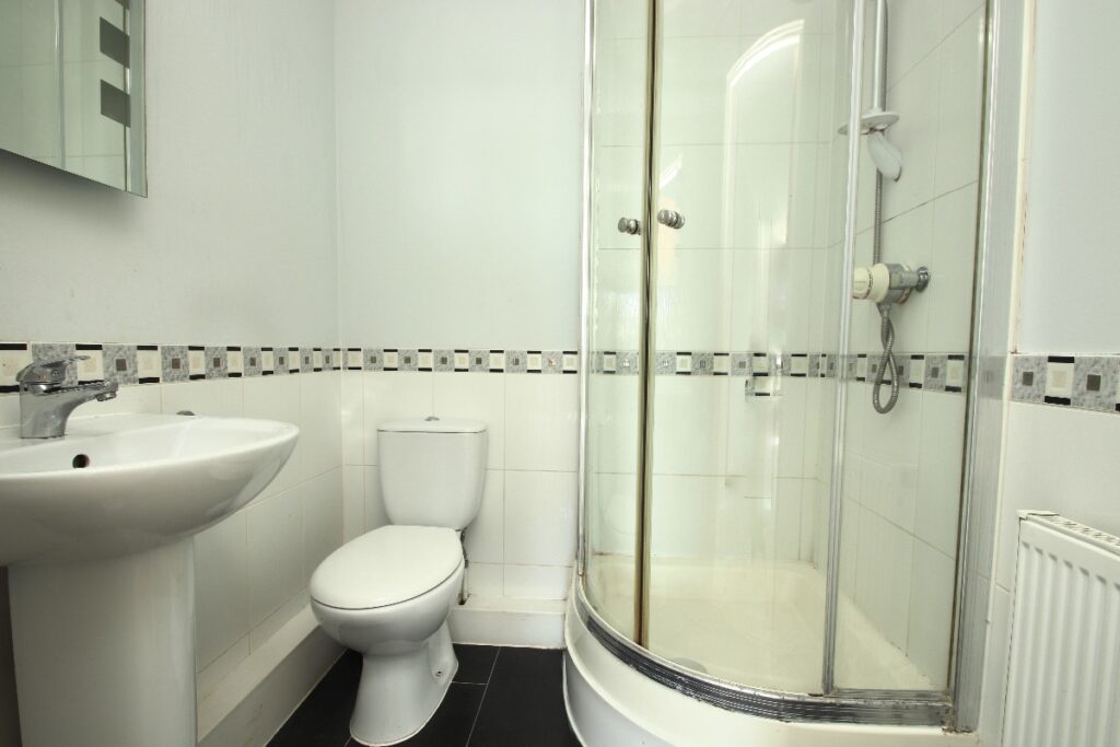 The apartment boasts two well-proportioned double bedrooms, one slightly wider than the other, both benefiting from relatively new, plush carpeting that adds warmth and comfort. The main bedroom is enhanced by its own private ensuite shower room, providing added convenience and luxury. A contemporary family bathroom, elegantly finished with quality tiling, completes the accommodation. The clever design includes plenty of built-in storage options throughout the corridor area, ensuring a clutter-free living environment.